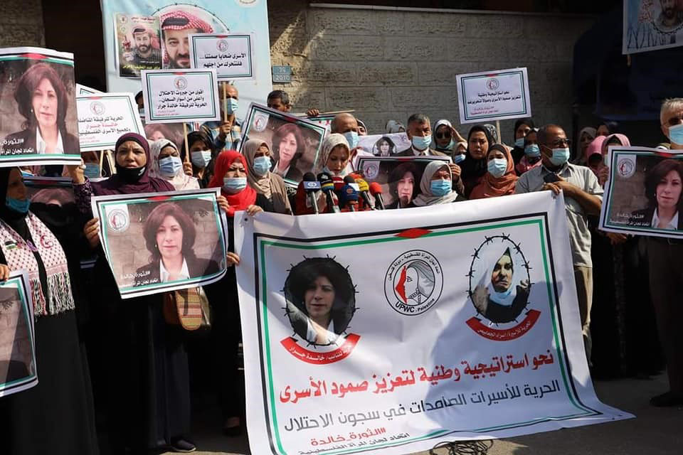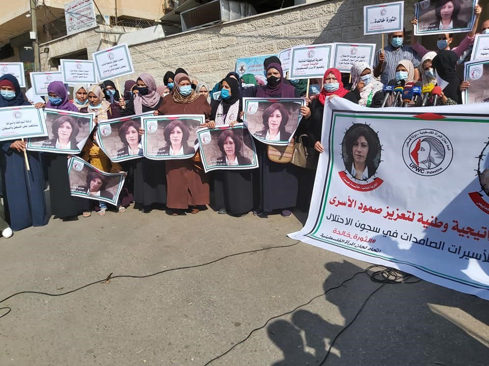 الوقفة الاسنادية التي نفذها اتحاد لجان المرأة الفلسطينية مع الأسيرة النائبة خالدة جرار في ذكرى مرور عام على اعتقالها في سجون الاحتلال من امام مقر الصليب الاحمر في مدينة غزة