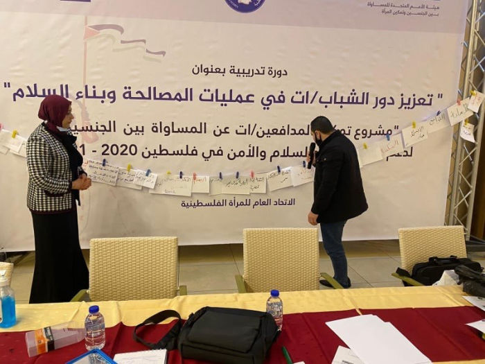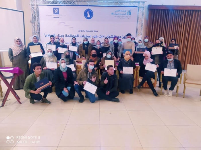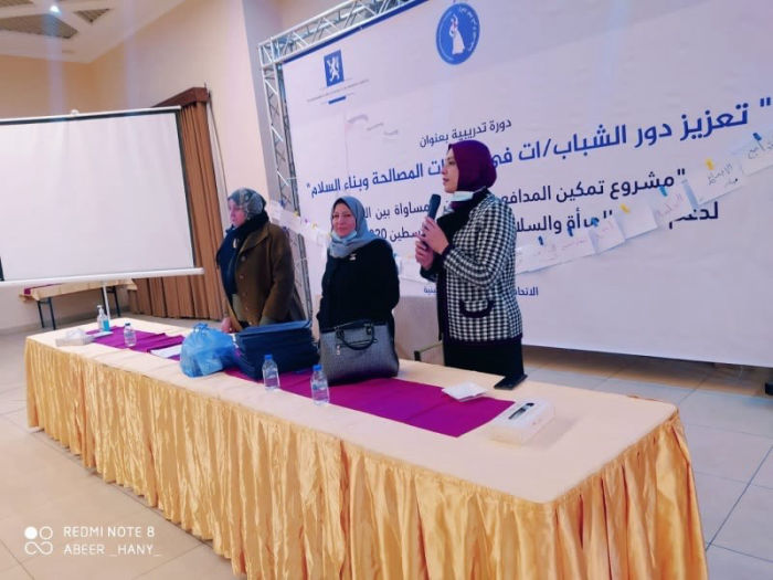 اختتم الاتحاد العام للمرأة الفلسطينية تنفيذ دورة تدريبية للكوادر والقيادات الشابة بعنوان " تعزيز دور الشباب/ات في عمليات المصالحة وبناء السلام"، وبحضور الأخوات نهى البحيصي واعتدال أبو قمر عضوات الأمانة العامة في الاتحاد العام للمرأة ، يأتي ذلك ضمن مشروع "تمكين المدافعين عن المساواة لدعم أجندة المرأة والسلام والأمن في فلسطين"، بالشراكة مع مكتب الأمم المتحدة للمرأة وبتمويل من الممثلية النرويجية في فلسطين، وذلك بهدف بناء قدرات القيادات النسوية والشابة وتعزيز مهاراتهم القيادية، من أجل دعم مشاركتهم في الأحزاب السياسية وحوارات المصالحة والأمن والسلام