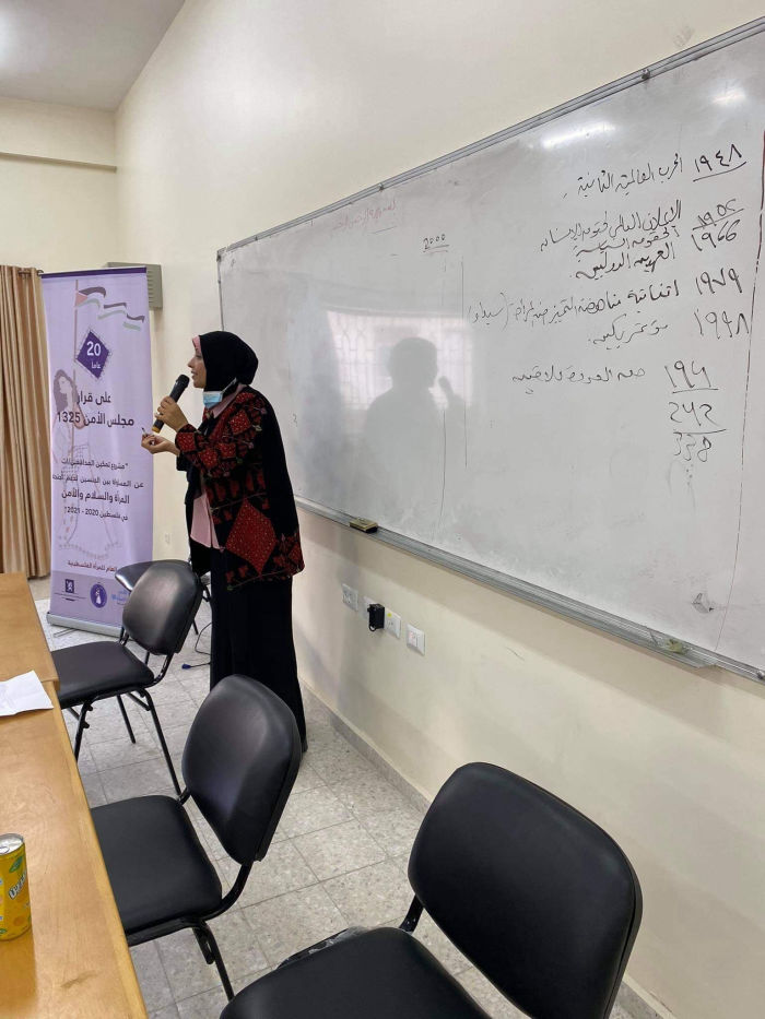 حيث قامت أ.م. روز المصري ناشطة ومدربة في الاتحاد، بشرح مفصل عن القرار الأممي 1325 باعتبار أنه الأول لمجلس الأمن يسعى لحماية المرأة خلال الحروب والنزاعات المسلحة، وتعزيز دورها في المشاركة في صنع القرار وحل الصراعات، وأهميته للمرأة الفلسطينية بشكل خاص، ولدعم القضية الفلسطينية على مختلف المستويات الرسمية والشعبية الفلسطينية بشكل عام إلى جانب الضغط والمناصرة باتجاه عرض كل ما يقوم به الاحتلال الإسرائيلي من انتهاكات بحق الشعب الفلسطيني بشكل عام وما تعاني منه المرأة الفلسطينية بشكل خاص وانعكاسات تطبيق القرار على المرأة وأهمية مشاركتها في مواقع صنع القرار وصناعة السلم والأمن، ودورها المطلوب في المصالحة الفلسطينية