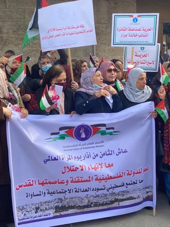 ومن خلال رفع اليافطات والشعارات وجه الاتحاد العام للمرأة الفلسطينية والأطر والجمعيات والمراكز النسوية بتحيات الاكبار والاعتزاز للمرأة الفلسطينية المناضلة في جميع أماكن تواجدها داخل الوطن والاراضي المحتلة في العام 1948 واماكن اللجوء والشتات، الساعيات بكل قواهن مع شعبهن للتحرر من نير الاحتلال الاسرائيلي طويل الأمد وظلمه وبطشه